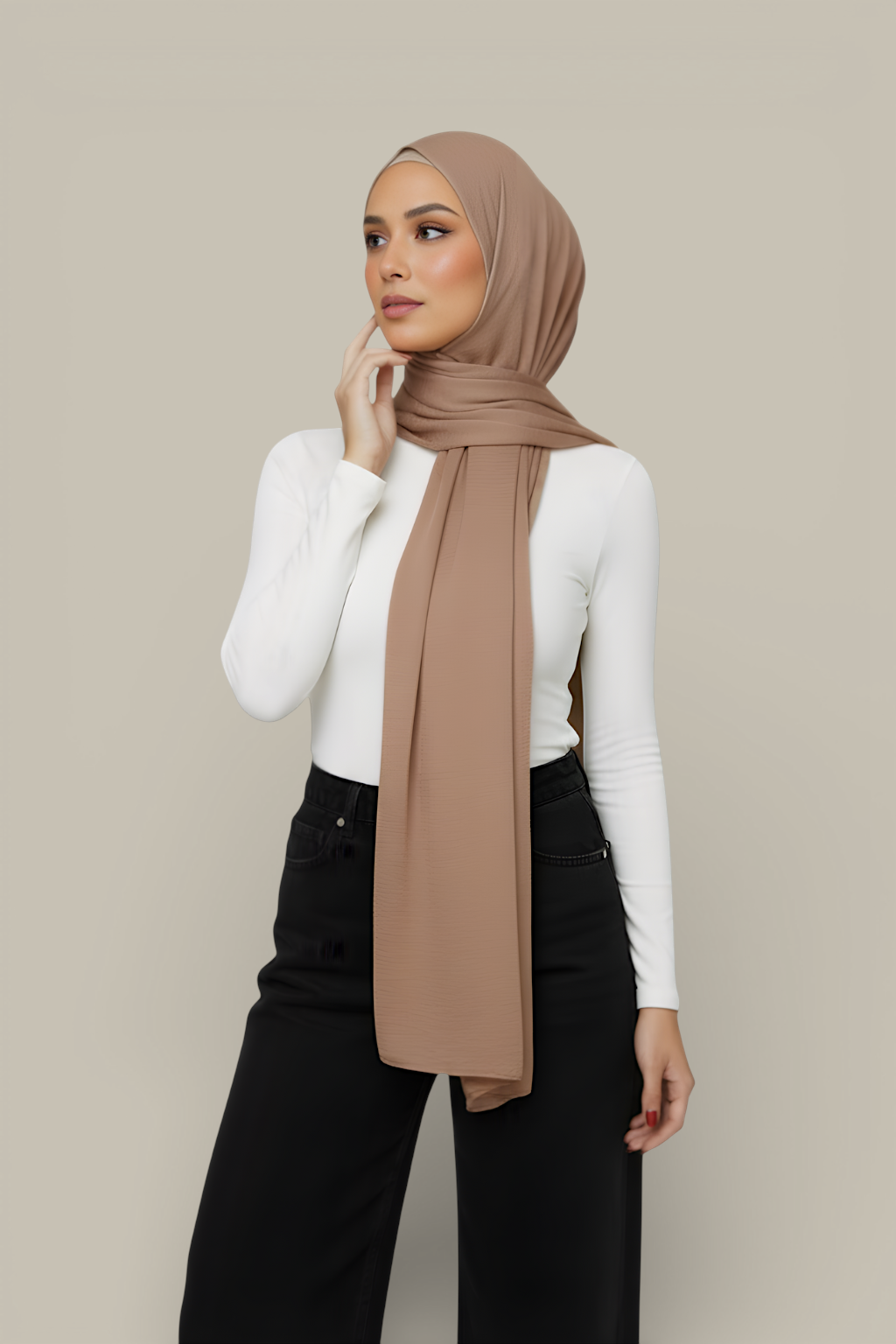 Ideal for hijab wear and modest styling, it provides generous coverage while maintaining a smooth, refined finish. The weight makes it perfect for those who prefer a non-slip, well-structured hijab that stays in place throughout the day.